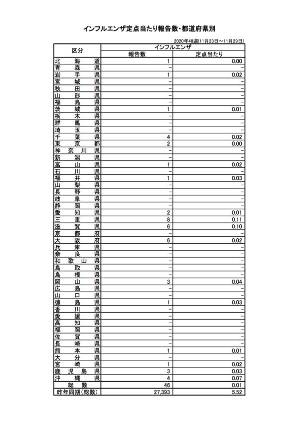 2020.11/23〜11/29の1週間でのインフルエンザ感染者数