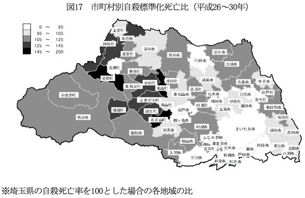 埼玉県の市町村別自殺死亡比を見ると明らかなように、東京都心のベッドタウンとも言える沿線上の県南、さいたま市や所沢、川口などで自殺死亡率が低く、山間部や県北が高いのは地場産業の脆弱さや過疎化と無縁ではないでしょう。