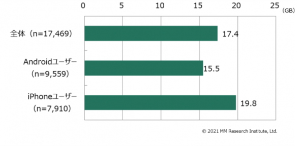 - 利用者の平均Wi-Fi利用データ通信量:Android:15.5GB、iPhone:19.8GB