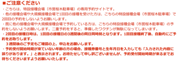 8/6 AM10:00〜に再度WEB予約にアクセスすると...8/16〜8/29枠で特設接種会場でのWEB予約が取れるようになっていました。各日の時間帯枠30人くらいで早いもん勝ち、幾つか接種会場を選べる風ではありましたが、結局我が家の住所では「市営桜木駐車場特設接種会場」一択、もちろん近所の医療機関での個別接種も可能みたいだが...手続きが面倒そうだったので...パス。