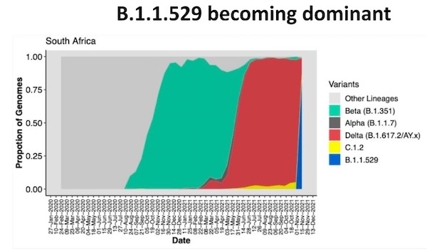 ....要するに まだ何も解ってないけど、分析屋さんが「ヤバそう!」と直感したので、とりあえず命名して要注意しときましょ、という段階です。クリスマス前には具体的な感染力や対応策等の発表があるでしょうね。とりわけ南アフリカ現地でこれまでの感染主体だったデルタ株からオミクロン株への置き換わりについて統計的な確認が明らかになれば、これは他地域での再パンデミックへの驚異になります。日本政府は以前みたいにもたもたしないで空港での入国制限を掛けてほしいもんです。