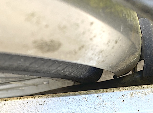 更に覗き込むと...明らかに後輪タイヤがフレーム・フォークに当たってます。