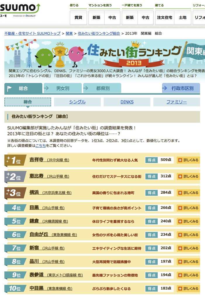 2013 関東の住みたい街ランキング
