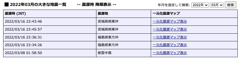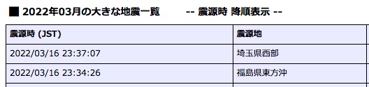 翌朝起きてから改めて地震速報:Hi-Netのバックナンバーを確認してみると、驚くべきことが解った。リストが書き換えられて「埼玉西方震源」が無くなり「福島県東方沖」が別時刻で差し込まれ、尚且データ自体も置き換わっていた。