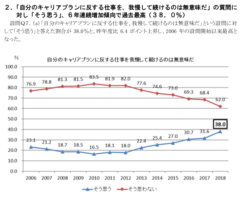 リーマンショックを境にしたそれまでとそれ以後、という分け方も考えられる「新入社員意識調査」ですが、リーマンショック前までは「失われた20年」と散々不況を喧伝されっていた時代ですから、なんとか就職した会社にしがみつこうという意識も高かったんだろうと思います。リーマンショック以後は企業のさらなる合理化、生産性アップ、見えない将来性なんかも露呈する時代となり、いよいよ生涯詰め切るなんてのは鼻から見込めないと踏む新入社員が増えた...そんな感じです。