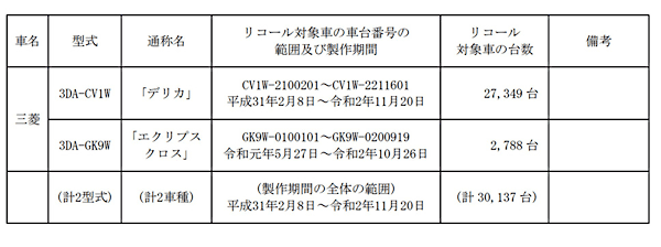 対象となるのは2019年2月8日から2020年11月20日に製造された3万0137台。