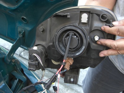 ハロゲンバルブを変える手順を少しだけアレンジしてバーナーHIDバルブを取り付けます。デジインショップのHIDバルブは台座長が比較的短い(44mm)ので、フタの加工をしないでも閉まります。