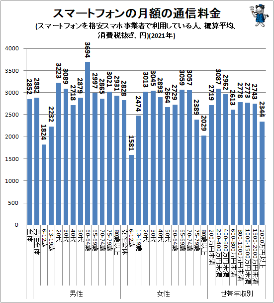 金額だけの比較だとジブンのスマホ利用は「6-12歳」以上ではあるけれど、「80歳以上」には及ばない、という変な日本語になります。