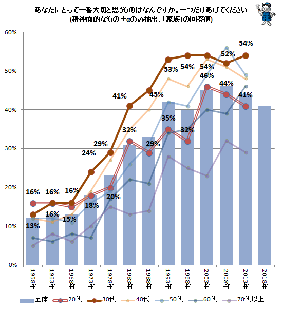 それでも60代以上の半数近くのヒトがとにもかくにも「家族」を「一番大切なもの」に挙げているというのは喜ばしいコトではあります。