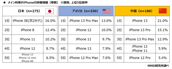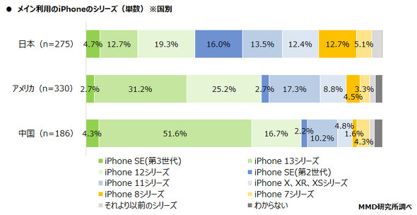 ”シリーズ合計”として合算するとiPhone12シリーズが19.3%、iPhone13シリーズが12.7%と中国、アメリカに比べて最新機種需要は低いらしいです。