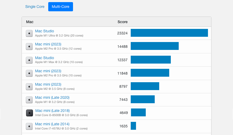Primate Labs Inc,が、クロスプラットフォームに対応したベンチマークアプリ「Geekbench」で集計したMacのスコア「Mac Benchmarks」から、mac mini のベンチマークスコアを抜き出して比較してみた(→ Mac Benchmarks)