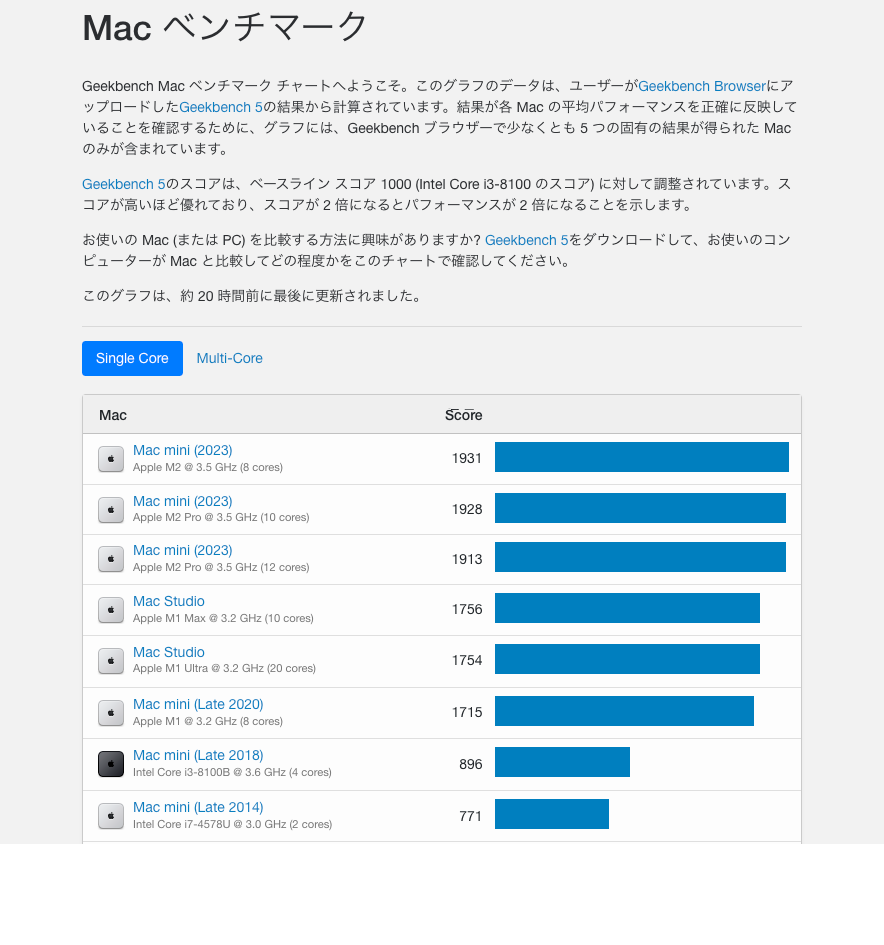 見る影もないベンチ結果のIntel版mac miniでさえ現役で充分に使えています。こんなSPECはホントにヘビーな使い方をする限られた専門職ユーザーにとっての指標でしかないので、一喜一憂はほどほどに.....