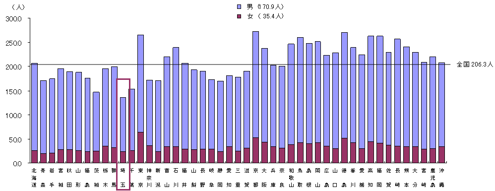 都道府県(従業地)別にみた医療施設に従事する人口10万対医師数