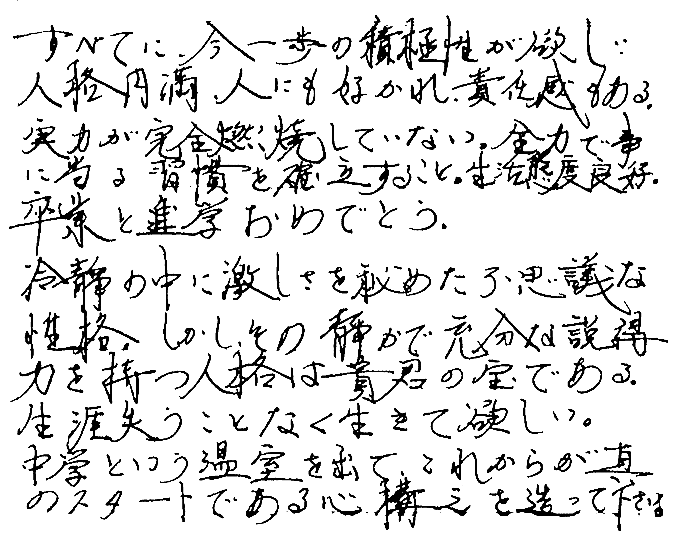 ジブンの中学生時代のスクラップを紐解くと卒業時に渡された通知表が出てきました。”金八先生”以前にあたるジブン達の時代の卒業式もドラマチックな展開は記憶にありませんが、しかしながら担任は最後の通知表の通信欄に、締め括りの言葉をしっかり添えてくれておりました。