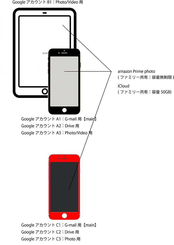 「G-mail」「Google Drive」「Googleフォト」Googleが提供するサービス領域毎にGoogleアカウントを所持すれば、それぞれ15GBが無償利用出来ます。必要に応じてそれぞれのアカウントを共有設定すれば、アカウントの切り替え操作さえ意識しないで使えます。知人の場合それまでの利用期間や利用状況から考えると、たぶん各領域専用のGoogleアカウントを持つだけで数年は無償で使えるはず....なんですが当人曰く「面倒くさいからこのまま100GB契約でいいよ」