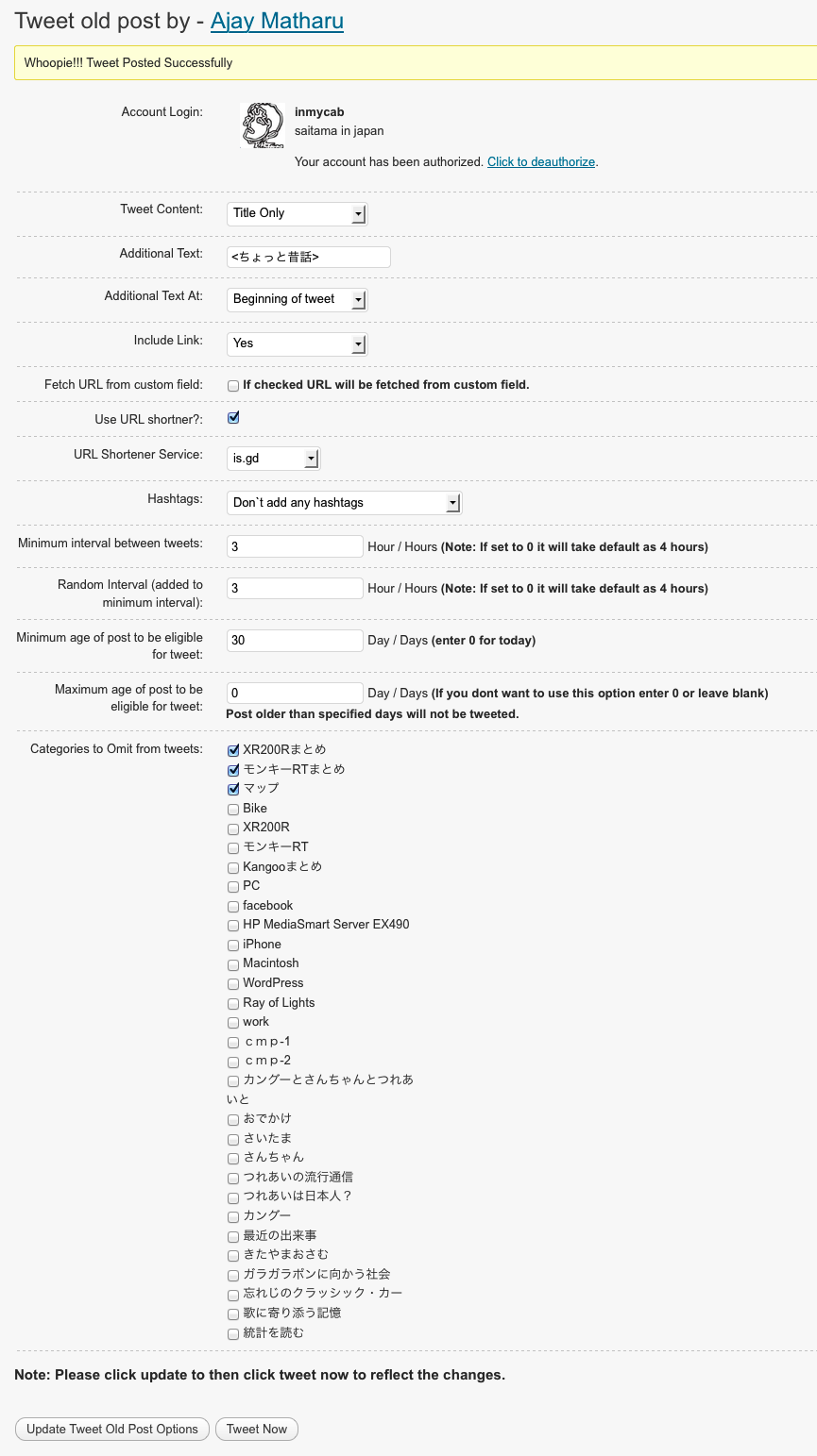 いざ試験的にTweetさせてみると...タイトル後半が欠けていました。ググってみるとどうやら「Tweet Old Post」がマルチバイトに対応していないトコロに問題があるようです。既に解決方法を提示されている方もおられるので、参考にしながらプラグインphpの一部を修正したところ問題なく使えるようになりました。