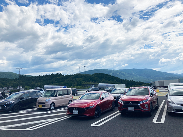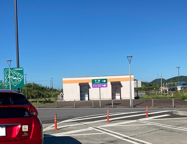それでも御殿場あたりからはスムースに流れだすのですが、SA、PAは入り口から1km以上並ぶ渋滞でした。そんななか鮎沢PAが見るからに空いてる様子で初回休憩。新東名を選択した後もSA、PAはずっと満車混雑でなかなか入り口の列に並ぶ気もしません。それでもトイレット休憩は必要なワケで駿河湾沼津PA (下り)に並びます。なかなか進まないなか離脱するクルマも多く、我が家も右端に寄ってPA通過ルートに。出口が見えたトコロで左側を見てみると...「あれはトイレではないか?」を発見! 進路を大型車の駐車エリアに切って近づいてみるとやっぱりトイレ!