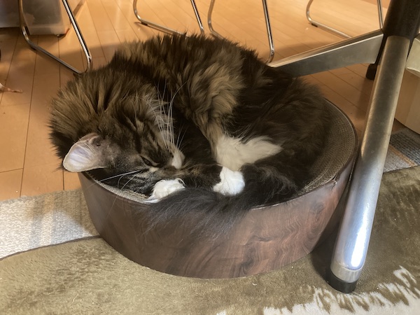 退院して帰宅したからと言ってもまだ元気を取り戻したワケでもなく、テーブル下で丸くうずくまる時間が長く、おしっこは出るものの3日間尿管点滴してた影響か度々”お漏らし”することも....お漏らしの度々、床を拭き拭き、カーペットを拭き拭きしてエポリオンで消臭の繰り返しで、つれあいも結構にイラッとしておりました。