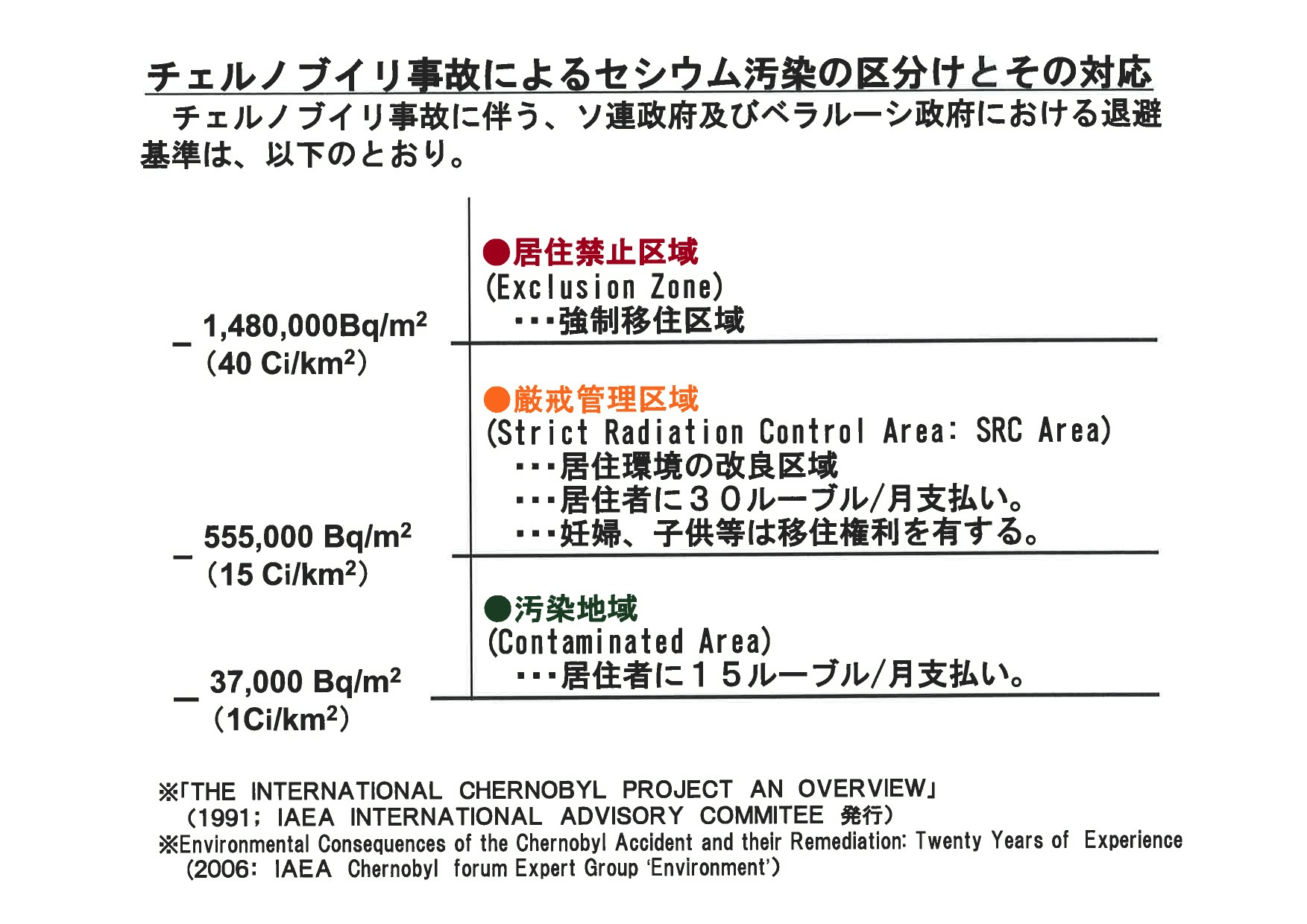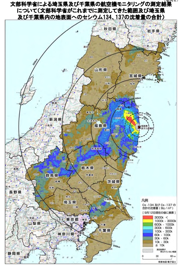 群馬県の7割、茨木県・千葉県(もしかしたら東京都)の一部も侵食している 30k-60kBq/㎡で示されている地域でさえ、チェルノブイリで言うところの 第4区画(unnamed zone :>37,000Bq/m2)相当で、チェルノブイリでの政府対応として「人が永く住むのに適さない」「滞在期間に制限を設ける」地域だとされています。