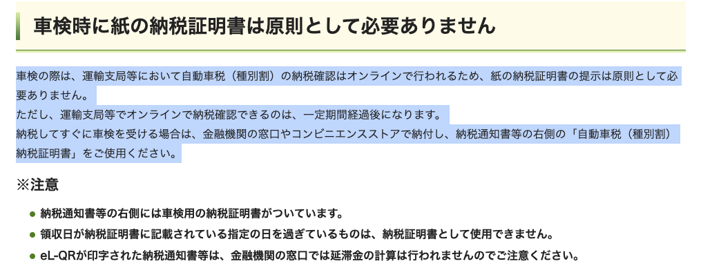 現在では車検の際、運輸支局等において自動車税(種別割)の納税確認はオンラインで行われるため紙の納税証明書の提示は原則として必要ありません。とのことですが、あくまで自動車税を納付済みである場合の話です。