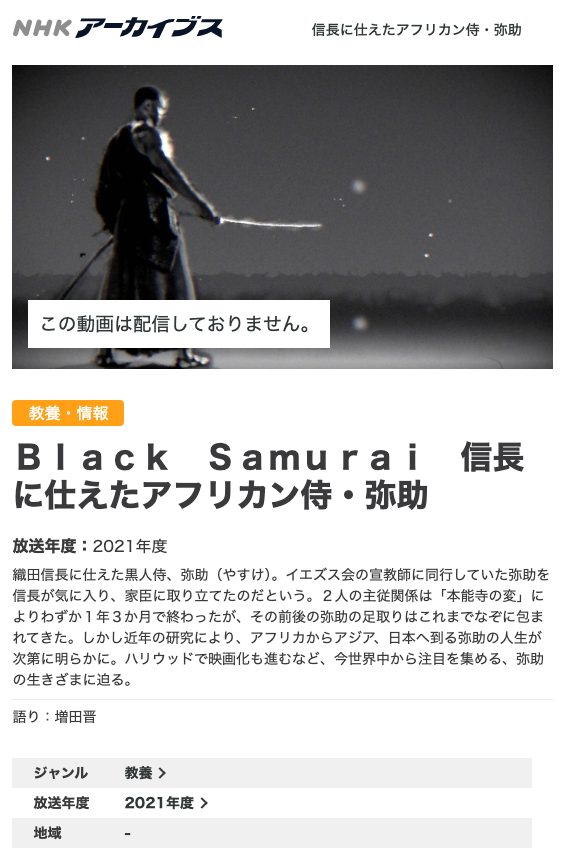びっくりするのは NHK公共放送が「アフリカン侍:弥助」というタイトルで”教養番組”として情報拡散・宣伝に全力投球していた事実。やっぱり歴史公証なんて検証せずに下請け制作会社に丸投げしてたんだろうなぁ... アサクリ騒動の大炎上を知ってか知らずか現在、NHKアーカイブでは視聴できなくなっています。