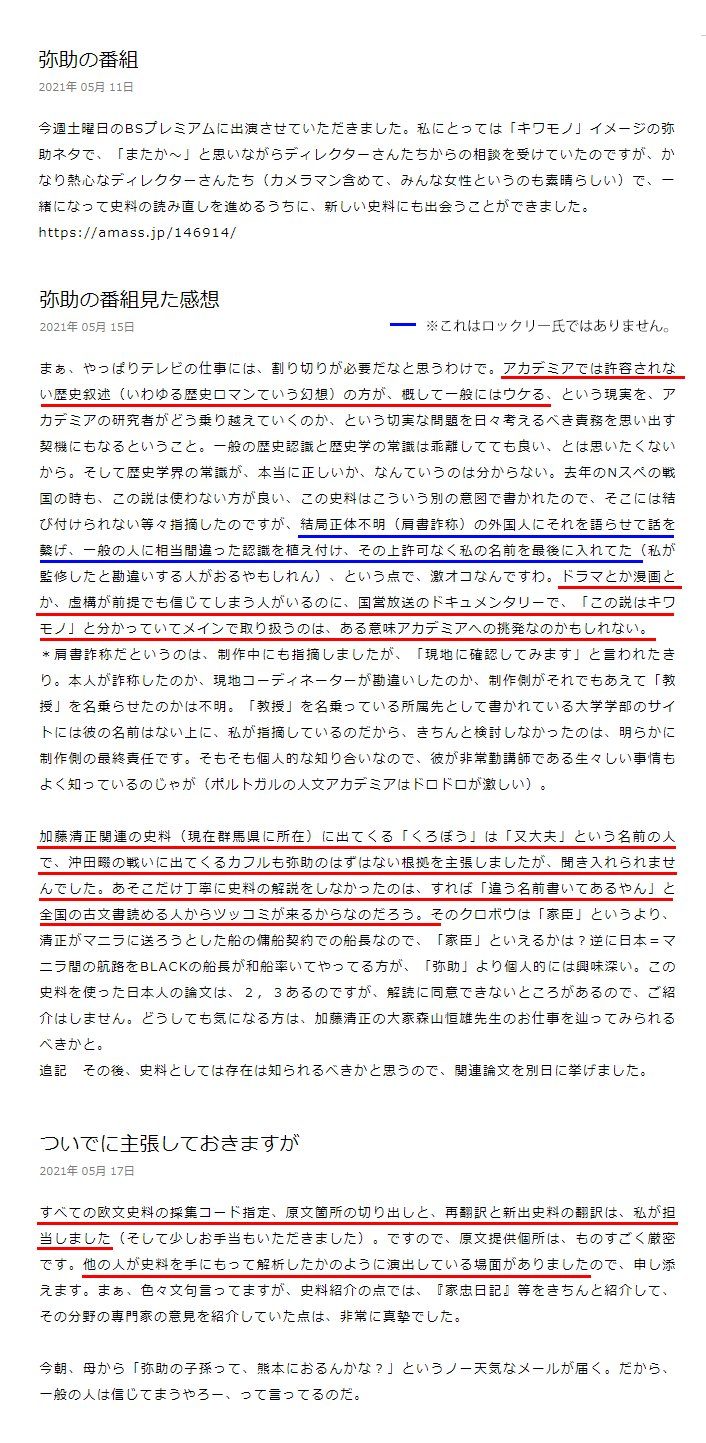 予想した通り中途半端に擁護する著名人風や歴史学者風なヒト達が大炎上に巻き込まれていると、というか理論武装なしに首突っ込んで大火傷して逃走...という展開になっています。そもそも歴史研究って想像力ありきでないと成立しにくい学問で、恣意的に書かれた当時の一次資料だけで論を組み立てても大きな間違いを生むわけで、複数資料の突合でやっと”それらしき”史実が出来上がるワケ。だから新資料が出現するとひっくり返ることがあるのがままあるのが前提みたいな学問です。だから言葉選びが難しいというかリスキーな商売。