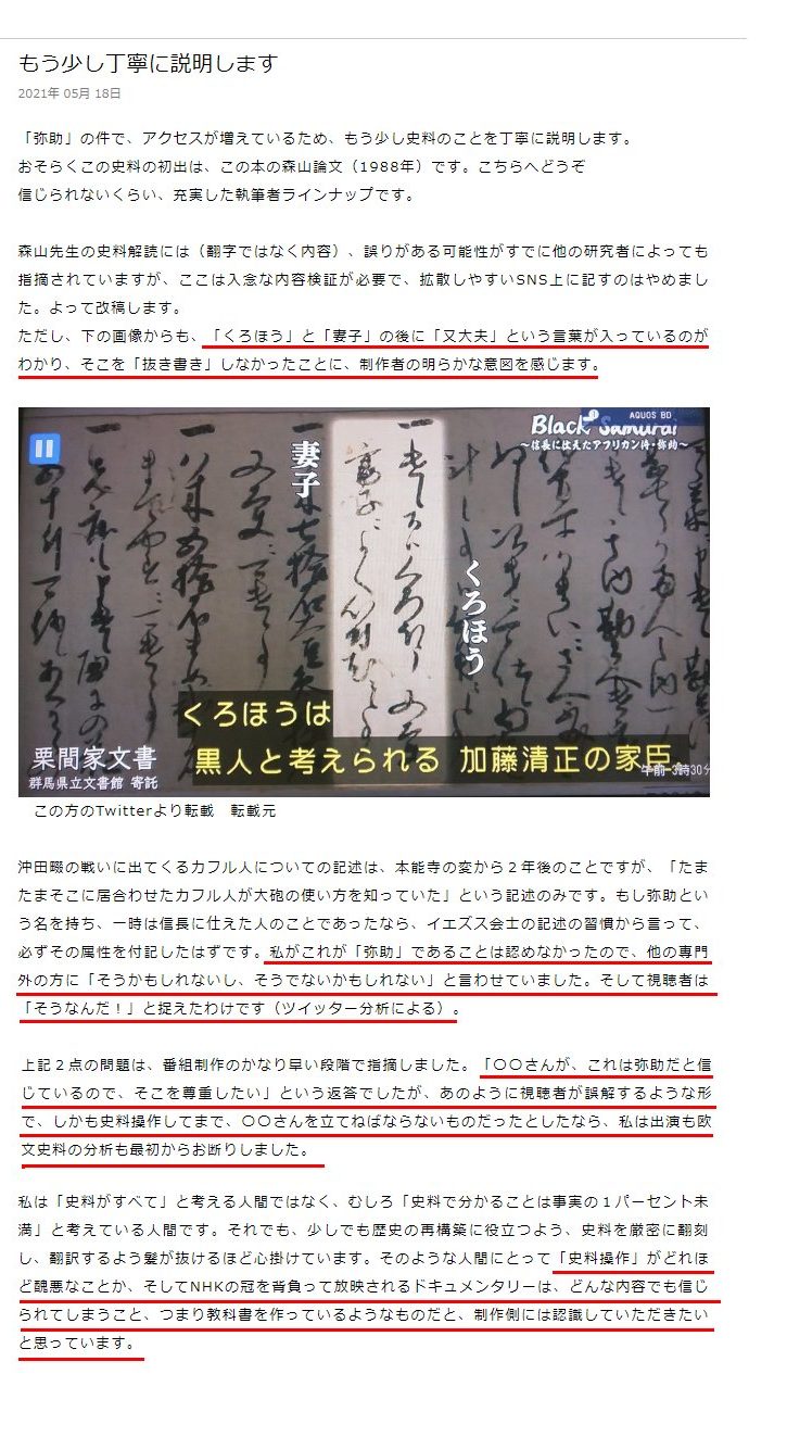 放送後、弥助の記録については岡美穂子さん(東京大学史料編纂所准教授)から以下の指摘があったもののNHK側はスルーだったようです。