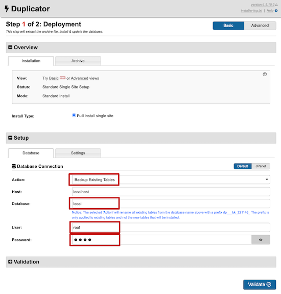 Setup /DatabaseConnectin 項目で Action「Backup Existing Table」を選択、「Database」「User」「Password」には、先ほど一時保管した「wp-config.php」に記載の該当項目名を入力します。