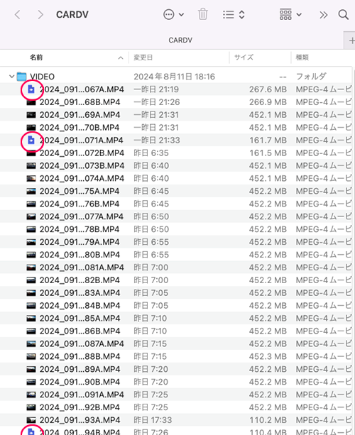 我が家のドラレコSDカードに記録されてる再生不可のエラーファイル(赤丸)