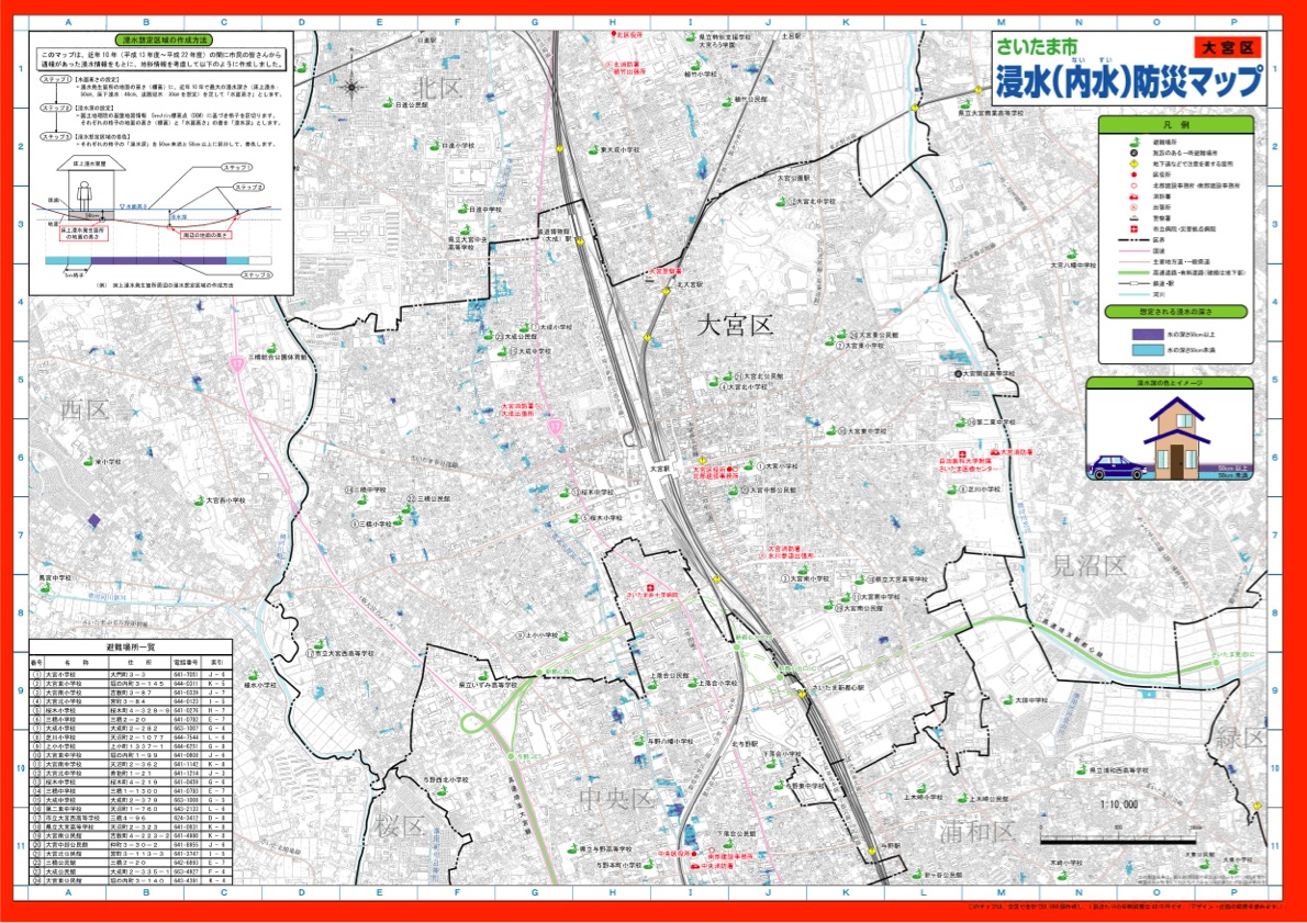 さいたま市の近年10年間(平成13年度~平成22年度)の浸水情報をもとに、地形情報を考慮した内水による浸水想定区域(浸水する範囲とその程度)及び避難場所などを示したさいたま市浸水(内水)防災マップが作成されています。さいたま市のホームページ(下水道部)からさいたま市各区の浸水(内水)防災マップがダウンロードできます。
