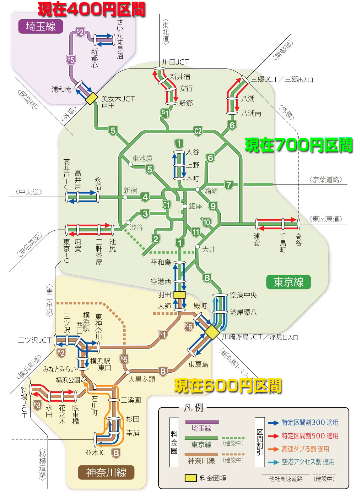 ウチなんか横浜・中華街行くのに片道1700円も払っていたのが900円に値下がりします。いちばん端の「さいたま見沼」の入り口がご近所にありながら、400円節約するため「美女木」まで下を走ることもしばしばでしたが、遠距離走行なら「さいたま見沼」からでも金額は変わらなくなります。「さいたま見沼」からだと「美女木」〜「板橋」あたりで24km超えるので距離別料金もへったくれもありません。ただ都内に出掛けるのに使うことは確実に減るだろなぁ、実質200円値上げだもん。