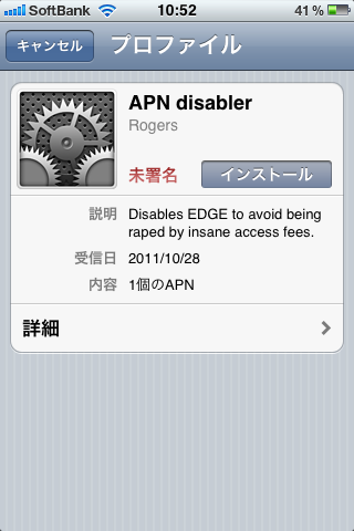 wi-fiエリアでは自動的にアプリがネット接続します。またプロファイルを削除すれば、出荷時設定に復帰します。もともとiPhone 3G(2008)用に作られたものですが、iPhone3GSやiPhone4のiOS5環境下でも動作するようです。アップルやソフトバンクが認めている方法ではありません。使用によりiPhoneの保証が無効になる可能性があります。あくまでも自己責任で作業はお願いします。
