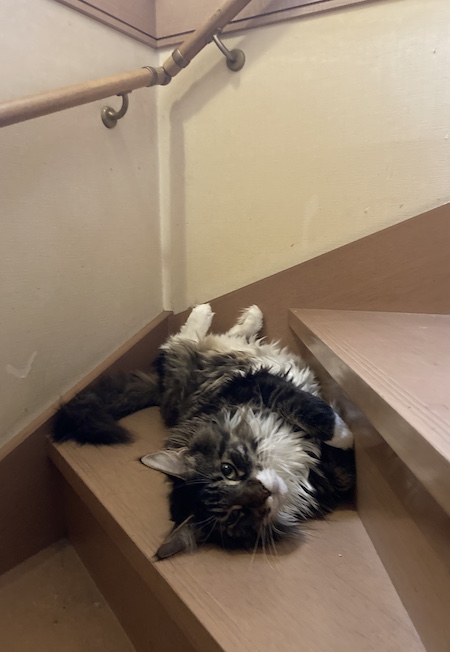昼日中にクソ暑い2階の踊り場に横たわる巨大猫
