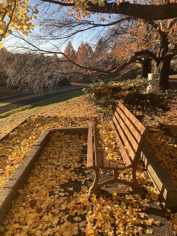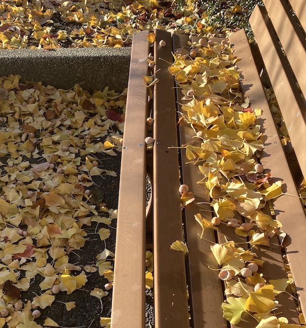 朝散歩の折り返し付近にあるベンチも直上のイチョウから銀杏の実の落下がいっぱいで...座れません。