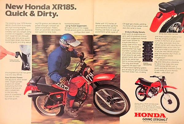 ![]() 1979 XR185 同年本格的エンデューロモデルXR を名乗る最初の車体として、鮮烈なTahitian Red & Blackをまとって登場しました。 エンジンはXL125S (JD02)の排気量を180cc(63x57.8)まで拡大、同時期発売のXL185Sに対して、高圧縮比(9.2→10.0) 、2mmボア径アップのキャブレター(PD14B→PD31A )等により、出力を向上(14.3→18ps)させ、6速ミッションを装備、サスペンションもロングストローク化し、軽量な車体(98kg)と相まって悪路走破性は格段に増しました。XR185は1979年のみの希少なオンリーイヤーモデルです。