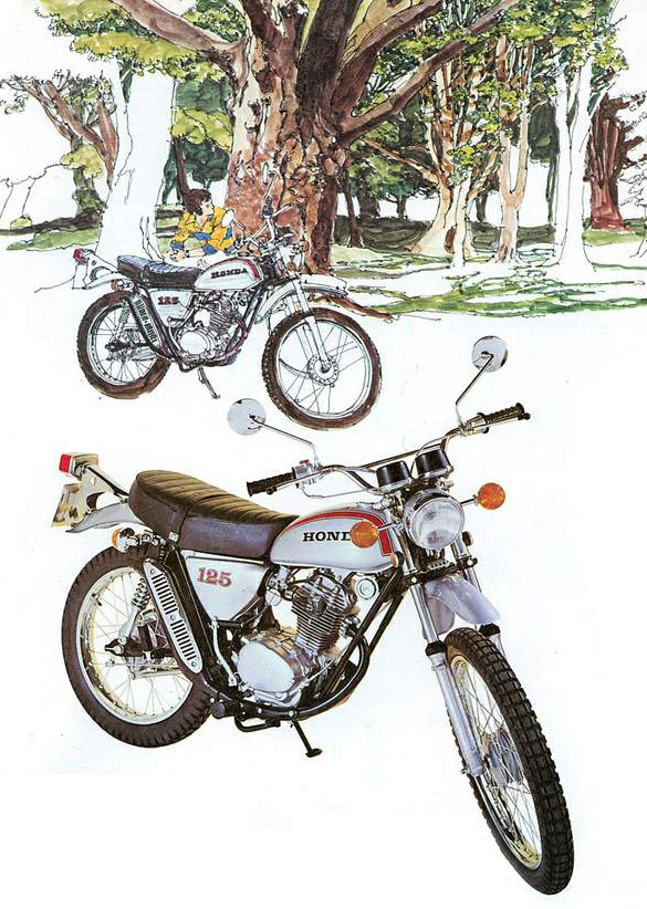 1973 XL125 K0 SL125の後継として登場したXL125 K0は、シングルクレードルのフレームとなりより大柄な車体廻りに変更されましたが。エンジンは旧来の122cc (56x49.5mm)版2バルブシングル縦型OHCのままでした。 1976 XL125 76 1975年国内発表のXL125(輸出仕様は1976年)は、旧来エンジンでの、クランク内圧縮背圧、一体構造シリンダヘッドの問題等を改修した新設計の124cc(56.5x49.5mm) エンジンを搭載。2ピース構造のシリンダヘッド構造、新型アップマフラー、吸気系へのアトマイザープレート追加で出力を1ps向上させました。