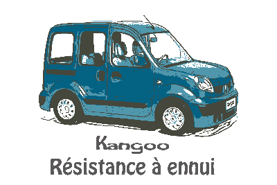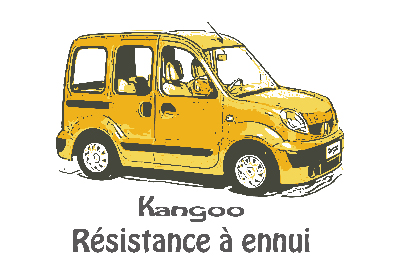 とりあえずプレーンイラスト版とレモンイエロー/インテンスブルー/カルメンレッド/コスミックグレー/ソレントグリーンの6色を揃えてみました。 Kangooのロゴはそのまま使うとルノーさんに怒られそうなので、雰囲気が似てるHoboフォントの変形版、「Résistance à ennui」は当時よく使われていたキャッチ「退屈へのレジスタンス」フランス語訳です。