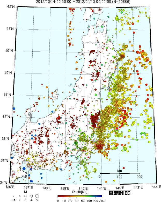 Hi-Net 自動処理震源マップ -東日本広域-(最近30日間累計)