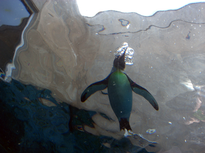 つれあいとは全国の動物園、水族館巡りの旅が多いのですが、今回のつれあいのメインターゲットもズバリ有名所となった夏期開園直後の旭山動物園です。しかし来園してみての感想は、つれあい曰く「つまんない…」上空(の水槽内)を飛ぶように泳ぐペンギンも、シロクマの水槽ダイブも、アザラシのガラスパイプ昇降も、いまではいろんなトコロで見られるアトラクション。オランウータンやテナガザルの空中散歩はちょっとおもしろかった...かな。正門から丘の斜面に沿って登りながら左右の展示舎を拝観していく様子が、なんだか東松山にある「子ども自然動物園」な感じです。