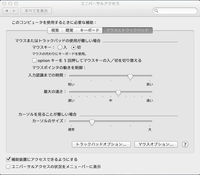 システム環境設定>ユニバーサルアクセス>マウスとトラックパッド画面で