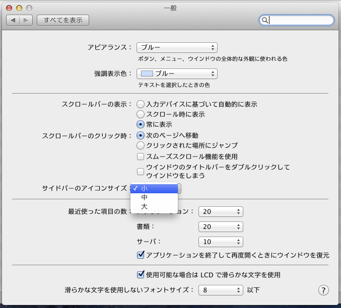 デスクトップ上のアイコンや書類・フォルダ名のテキストのサイズは、Finder>表示>表示オプションで変更できます。また各フォルダのウィンドウ画面内の項目テキスト等は、ウインドウ画面にある「表示オプション」で設定します。ウインドウ画面のサイドバー項目は、システム環境設定>一般画面内の「サイドバーのアイコンサイズ」で変更できます。