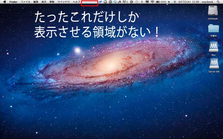 「MeNews」アプリ自体はリリース前のマイナーバグを手直しすればOK!な仕上がりだったんですが....ジブンのMACBOOKのメニューバーを眺めてみると....デフォルトセットの状態では「MeNews」でニュースをテロップできる領域がありませんでした。(「MeNews」に関する詳細説明はコチラ)
