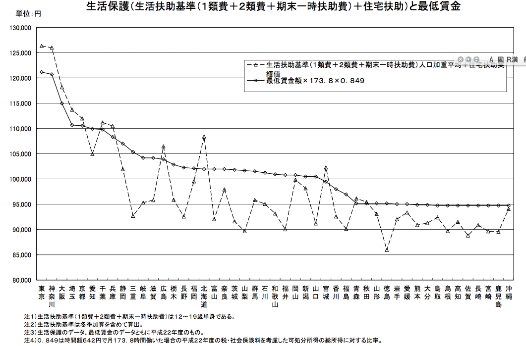 名目計算された最低賃金に合わせて生活保護給付水準を決めている、というのがホントであって憲法でいう「最低限の文化的な生活」を保証するために生活保護の基準を設定してるわけではない、とも読み解けます。(厚生省 平成24年 生活保護と最低賃金(PDF))