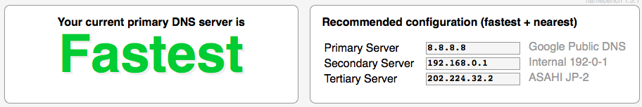昨年「Macネット環境を高速化するプロキシーサーバーGUIアプリ dolipo 〜LION対応」のときに設定したド定番DNSサーバ設定「8.8.8.8」ですが、世間では更に早いDNSサーバがあるような、ないような話が転がっていたりします。
