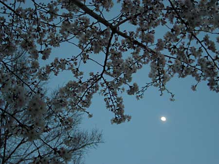 夕暮れ迫る頃にはまた寝てます。自分は相当疲れた日でも8時間以上寝ることが出来ませんが、連れあいは15〜6時間は平気で寝れるようです。そろそろさんちゃんの散歩の時間、予報が外れて空はお月さんものぞく良い具合なので、連れあいを起こして近所の公園へお花見散歩に出かけました。